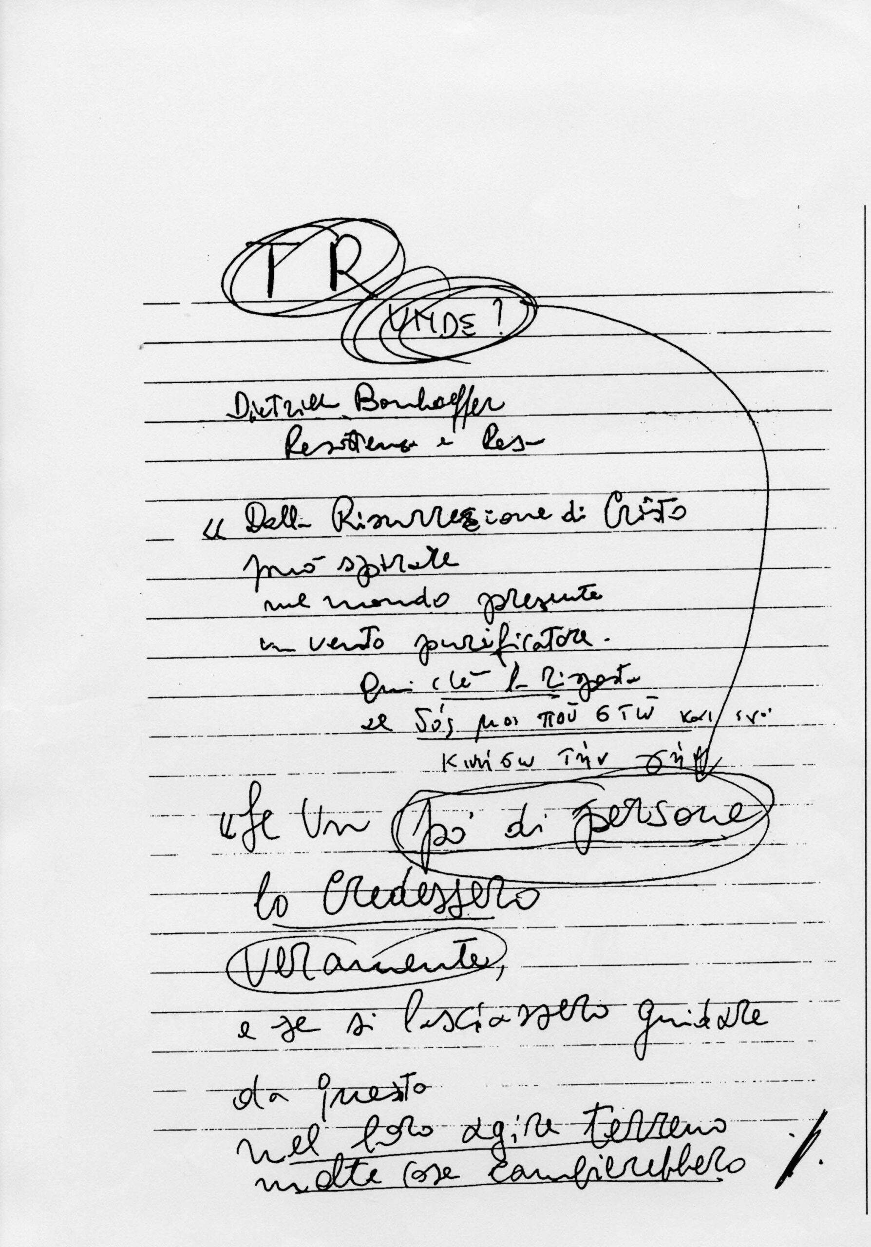 Ci identifichiamo più che mai con le parole scritte da Dietrich Bonhöeffer nel 1944 e fatte vita da don Sabino Palumbieri, il nostro fondatore: “Dalla Risurrezione di Cristo può spirare nel mondo presente un vento purificatore… Vivere partendo dalla Risurrezione: questo significa Pasqua… se solo un po’ di persone lo credessero!”